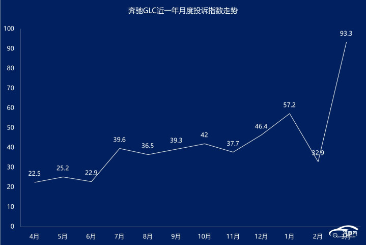 投诉数据显示,过去一年来,奔驰GLC的单月投诉指数几乎都在50以下。今年3月,奔驰GLC的的突然飙升到了93.3,环比2月份大幅上涨了近2倍。