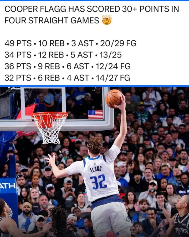 大概是什么概念呢?自从1976-77赛季NBA与ABA合并以来,只有五位新秀连续4场拿下30+,弗拉格之前的四人分别是:伯纳德金、乔丹、艾弗森、杰伦格林。