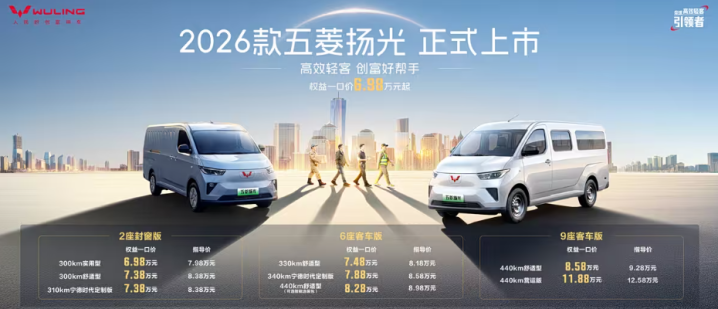 近日,2026款五菱扬光正式上市。新车共推出2座封窗版、6座客车版、9座客车三个版本,共8款车型,正式售价7.98-12.58万元,限时权益一口价6.98-11.88万元。